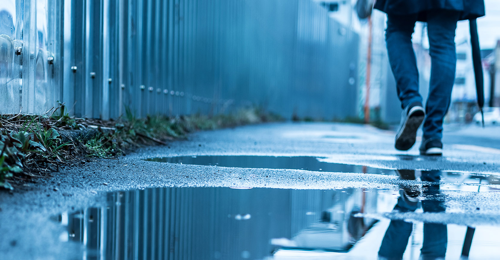 まず屋外では地面が濡れることにより滑りやすくなることです。スロープや少しの坂、その他タイル、マンホール、鉄板、横断歩道の白線などで滑って転倒するリスクがあります。さらに室内やオフィスにおいても濡れた靴底や傘のしずくで床が滑りやすくなり、階段なども転倒の危険があります。雨の日はとくに足元に注意が必要になります。